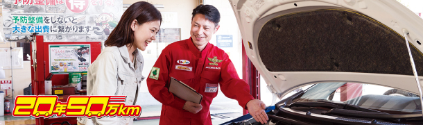 「タクシーのように50万km安全で安心して乗れるように!」をコンセプトとした20年50万kmサポート。お客様が自分の愛車に乗りたいだけ乗って頂けるよう全力でご支援いたします。代替えを勧めることなく安全で低価格で乗り続けられるように、皆様の真の味方となって尽くします。